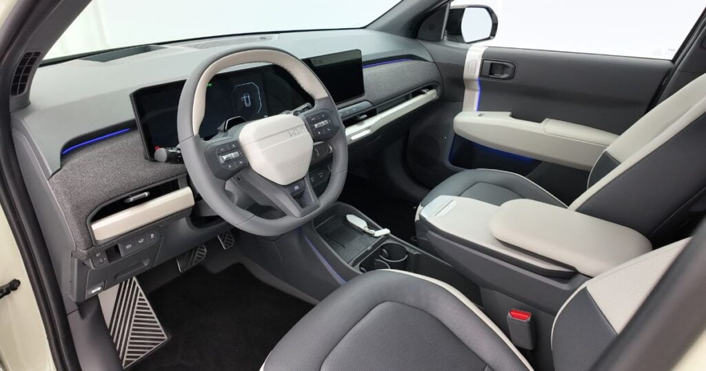 Hoppar vi in i bilen så känner vi igen oss från EV9, det mesta är likt från storebror. Det är dock skillnader i materialval, utseende och många gånger också känsla. Ratten har samma knappar som vi hittar på EV9 med skillnaden att de är matta i EV3, fortfarande halvdålig feedback när man trycker på dem dock.
