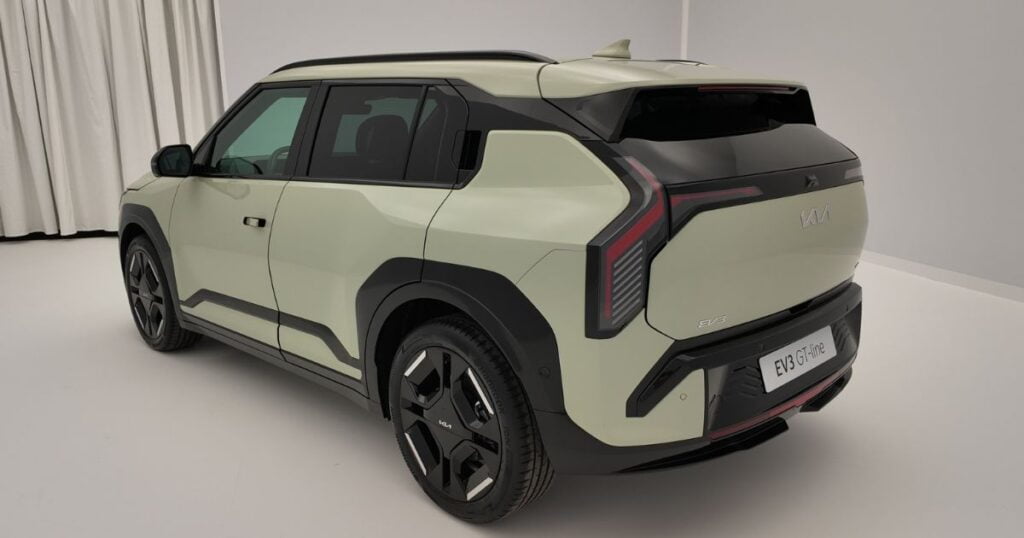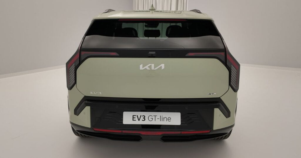 Modellen har tydliga former från EV9, det är tydligt att designen som EV6 har inte får följa med in i framtiden, Kia har hittat sin roll och det är kantigt. Dörrhandtagen har däremot EV6 fått låna ut, det är bra för de går inte in jämt och ständigt som EV9 gör. I bak ser EV3 ut lite som en uppblåst BMW i3, jag tänker på den gamla Fiat-reklamen när en 500 fick i sig en blå Viagra och blev en 500X.