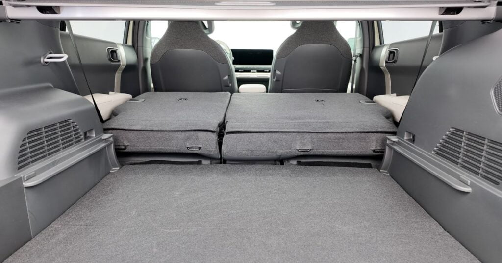 När jag sitter bakom mig själv får jag utan större problem plats både med knän och takhöjd. Knäna är högt upp som i de flesta elbilar tyvärr. Plasten på baksidan av stolen känns tålig och borde klara små barnfötter utan större bekymmer. Det finns moderniteter som sätesvärme, fläktgaller, USB-C som sitter på framsätena och därmed i bra höjd för att nå dem även när man är bältad samt armstöd med mugghållare.