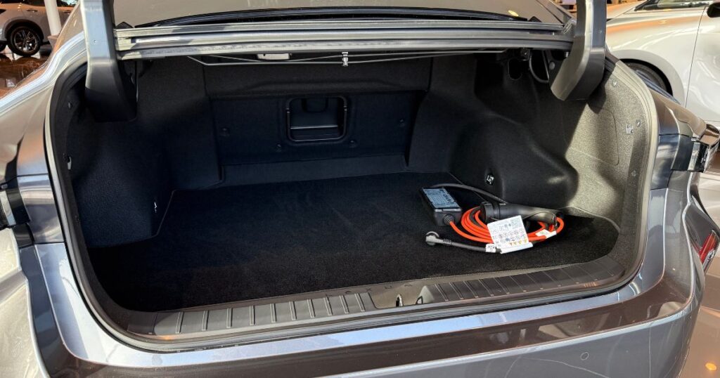 Trots att bilens utseende bjuder in till en halvkombi-lucka har Lexus valt att behålla sedanluckan. Det blir stort när man öppnar upp, men om det är så praktiskt är en annan sak. Det finns precis utrymme under golvet för en laddkabel, men inget 12-volts- eller annat uttag för ström. Det finns en genomlastningslucka för längre last. Precis som på tidigare ES går baksätet inte att fälla.