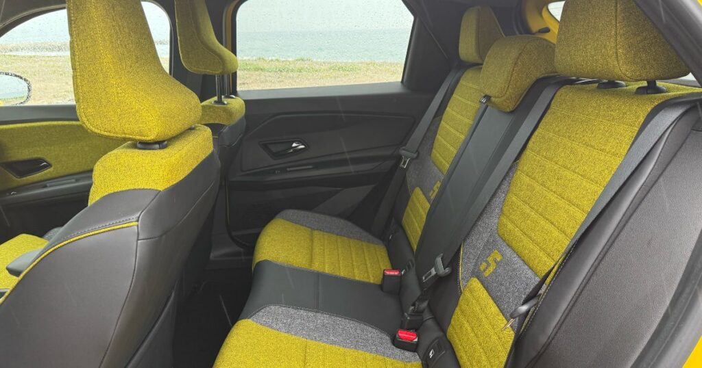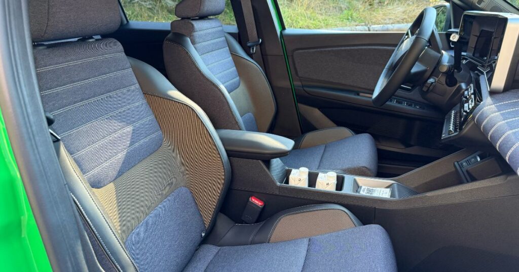 Dörrsidan är dock gjord i hårdplast och när jag smäller igen dörren så hörs inget härligt tjoff, det är snarare plåt-smäll som skvallrar om det billigare priset. Ovanför lädret så finns en högre kant i blankplast med LED bakom som snyggt skriver ut modellnamnet, en homage till den första generationen Renault 5.