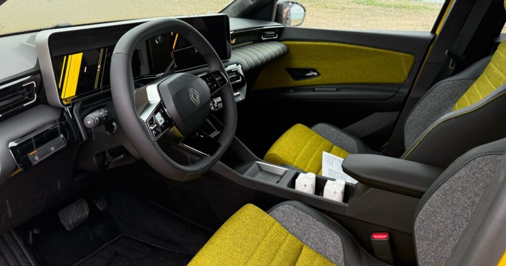 Jag och en kollega sätter oss i en gul Renault 5 och drar iväg. Jag sitter som passagerare och noterar snabbt att stolarna känns fasta och sköna, lagom bra skålning. Klädseln går i gult och grått medan instrumentpanelen är klädd i fejkläder (plast) men som ändå har en bra känsla när man tar på det.