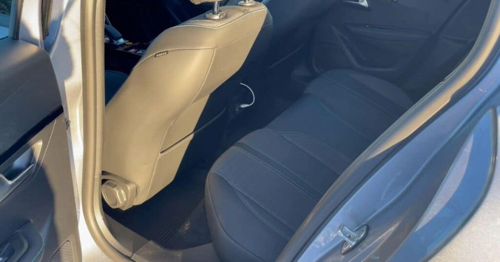 Apropå baksäte, så finns det ett sådant i Peugeot e-208, med egna dörrar, vilket inte alla bilar i den här storleken har. Däremot är det inte så stort. Det är trångt, jag får ner benet mellan förarstolen, som är inställd för mig på 180 cm, och soffan i baksätet. Jag kommer dock inte in och skulle troligtvis behöva ligga på sätena för att åka i baksätet i e-208.