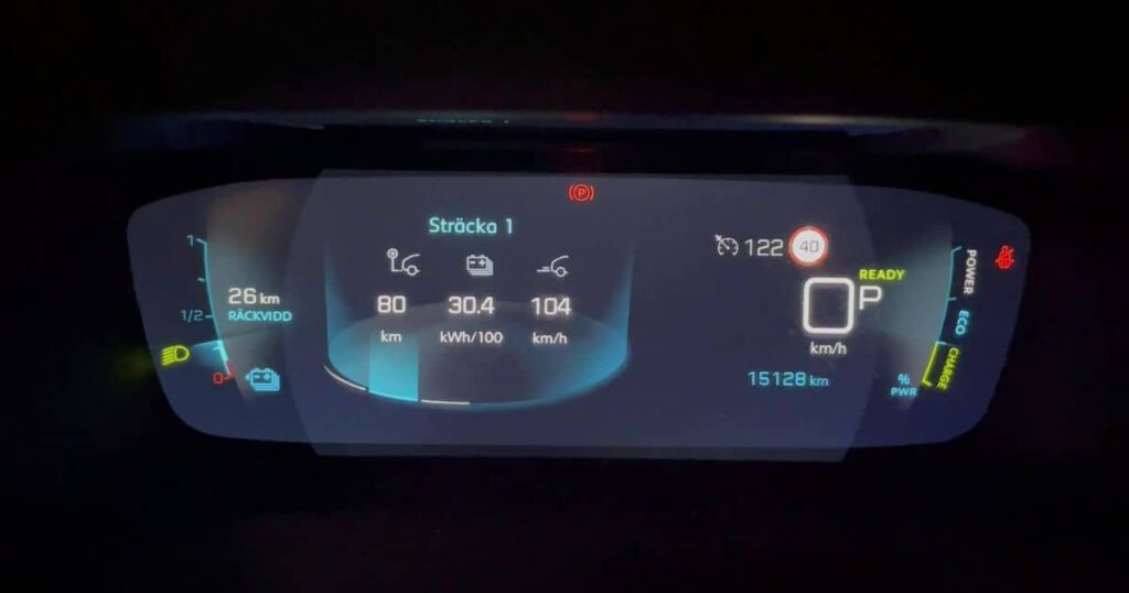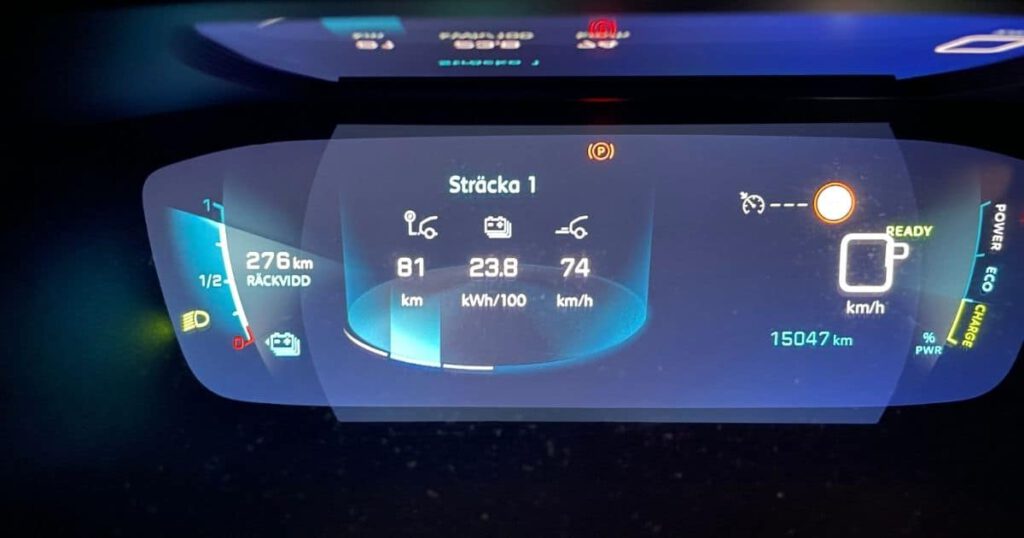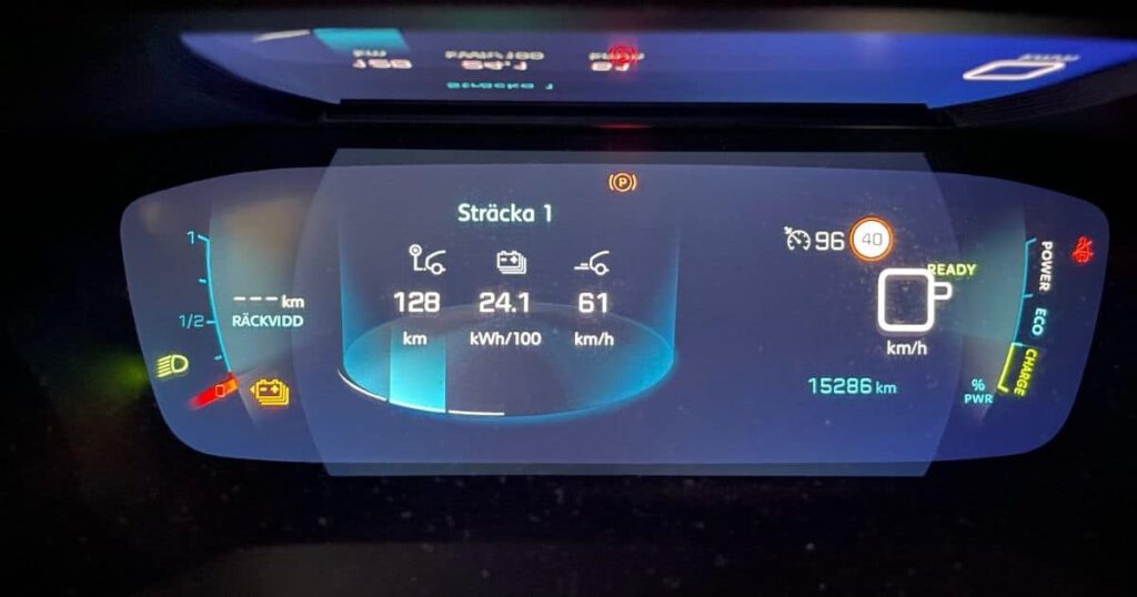 Vid ett tillfälle körde jag ganska långt ner på stapeln och bilen visade en symbol för lågt batteri. Räckviddsindikatorn slutade visade räckvidd och visade istället enbart sträck. Det gjorde såklart att man fick en klump i magen för om man skulle hinna fram till laddstolpen.