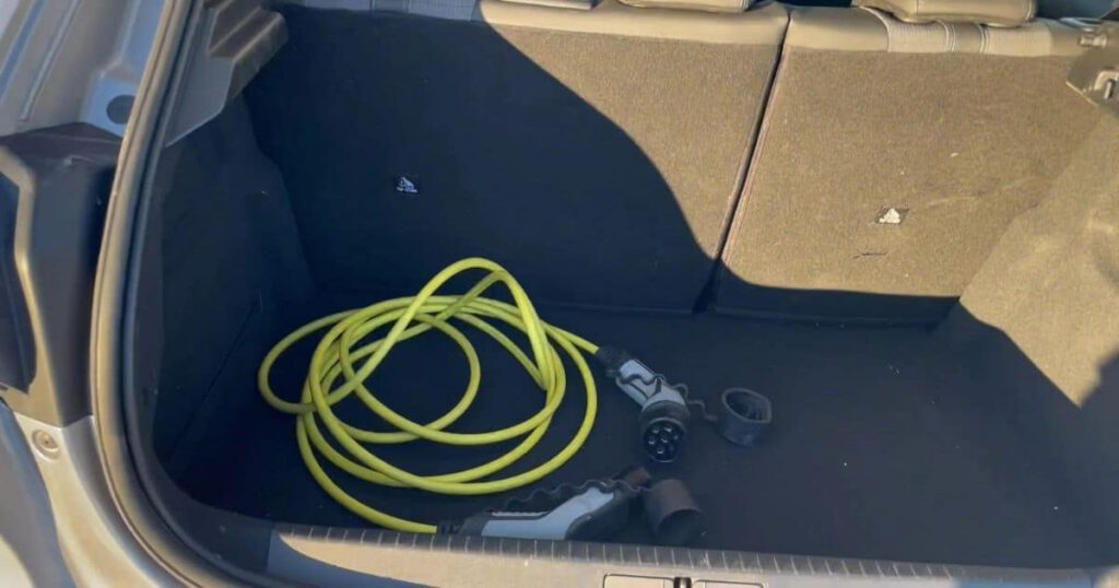 Det finns heller inget utrymme under golvet i bagaget. Det ställer till problem när man har en laddsladd man behöver åka runt med. Det finns inget ställe att lägga den på. När man köper en Peugeot e-208 så följer det med en väska men även den ska ju förvaras någonstans. Så av det lilla bagageutrymmet så finns behöver man reservera en del till laddkabeln. Om man inte kastar in den på golvet i baksätet.