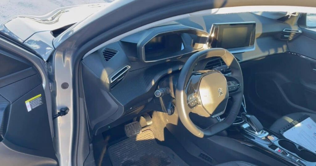 När man öppnar förardörren på e-208 så noterar man att det ser lite annorlunda ut jämfört med andra bilar. På Peugeot har någon bestämt att det vore coolt med en liten ratt och så har man gjort slag i saken. Ratten är så pass liten att man måste se över ratten för att titta på instrumentpanelen. Personligen var jag tvungen att sänka ratten för att kunna se det tydligt, vilket då gjorde att jag inte kände att jag hade ratten i optimal position.